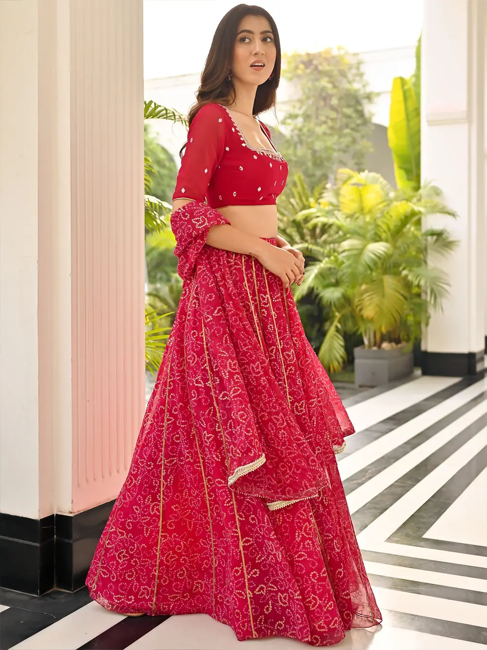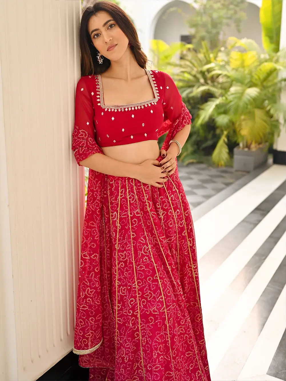 This stunning three-piece rani pink lehenga set is a perfect expression of festive elegance and traditional charm. Crafted in a vibrant Bandhej print, the lehenga features a beautifully flared kali-style silhouette, with each kali accentuated by intricate golden lace detailing that adds richness and dimension to the overall look. The blouse is adorned with mirror work all over, along with delicate handwork on the neckline, bringing sparkle and sophistication to the ensemble. The matching dupatta, made in the same bright, festive fabric, is finished with an eye-catching golden lace, adding a graceful touch. With its lively color palette, traditional craftsmanship, and refined embellishments, this rani pink lehenga set is perfect for festive occasions, sangeet, mehendi, or wedding celebrations.