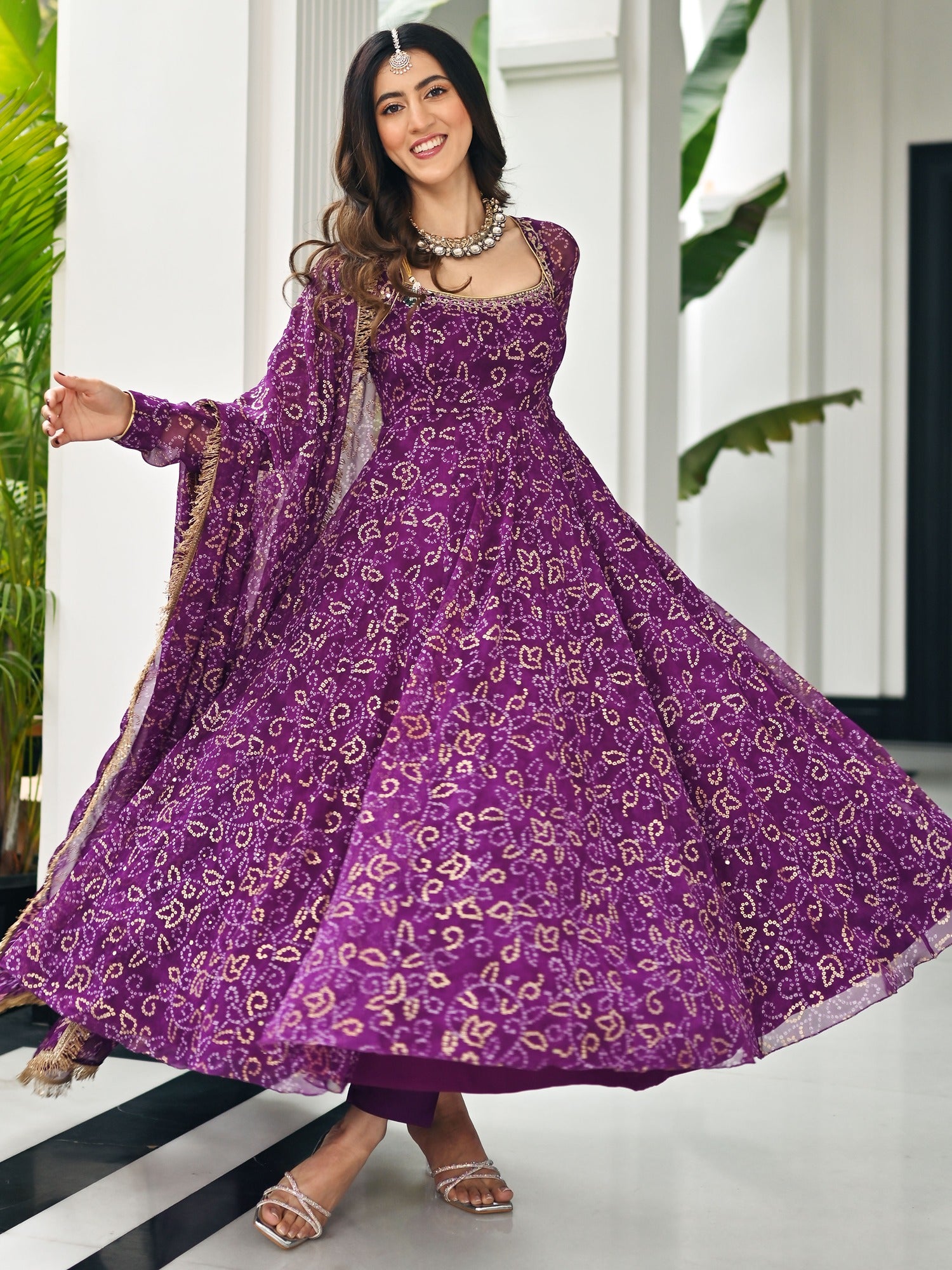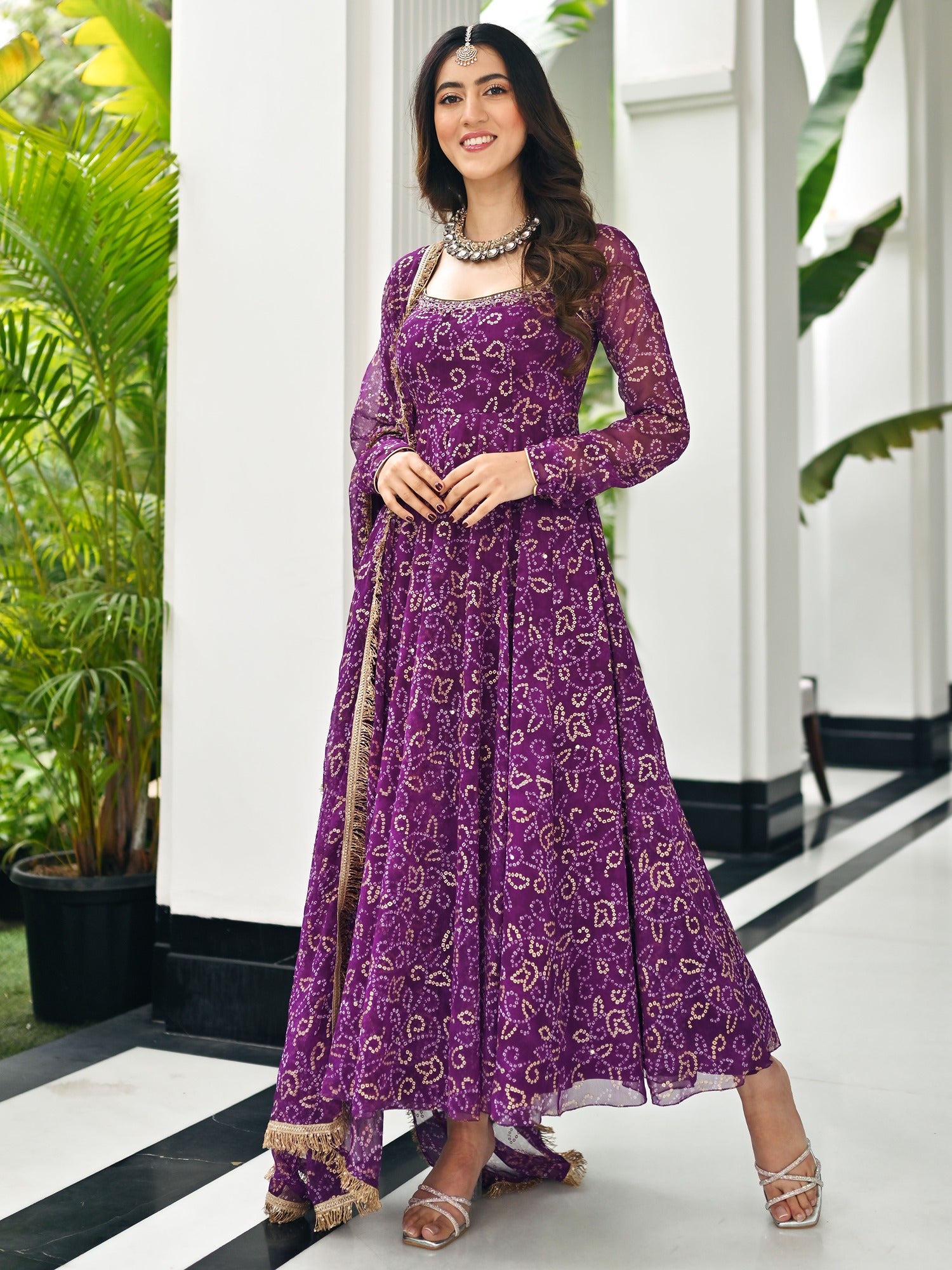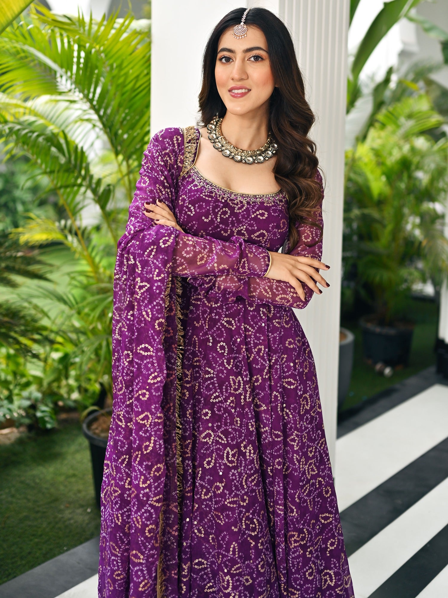 This beautiful three-piece purple Anarkali set is a perfect blend of traditional elegance and festive charm. Crafted in a rich Bandhej print, the Anarkali features delicate golden foil detailing that adds a subtle shimmer, making it ideal for celebratory occasions. The neckline is adorned with intricate handwork, highlighting fine craftsmanship and adding a touch of regal sophistication. The set includes a matching dupatta made from the same fabric, finished with a striking golden lace that brings vibrance and interest to the ensemble. With its bright festival colors and classic silhouette, this outfit is perfect for weddings, festive gatherings, or any special occasion where you want to stand out with grace and tradition.
