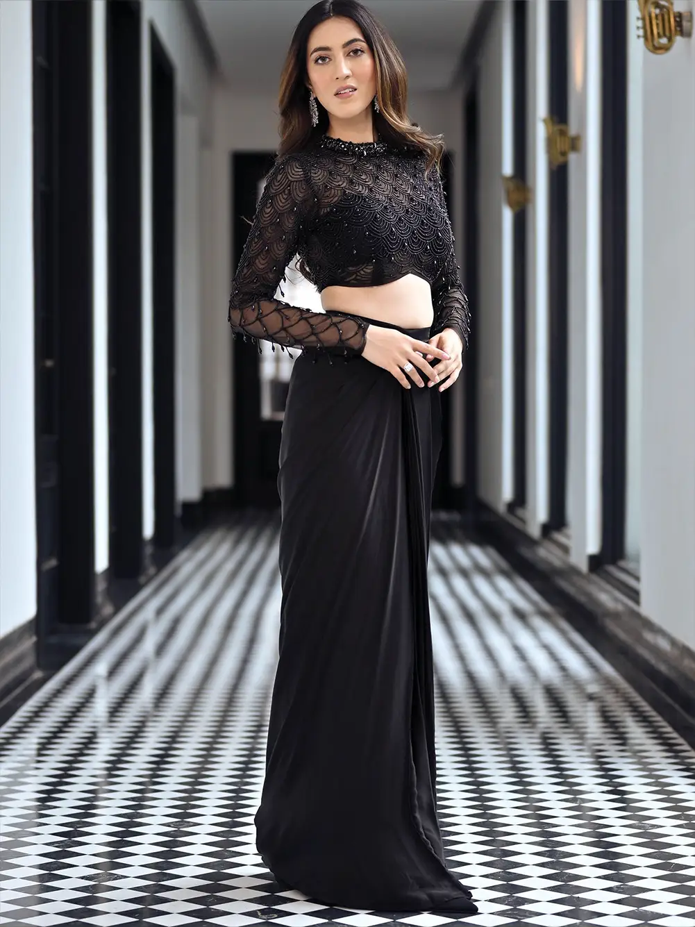This sophisticated black drape set exudes elegance and drama, making it an impeccable choice for the wedding season and cocktail parties. The top is beautifully adorned with intricate handwork and features full sleeves embellished with delicate beading, creating a captivating texture and shimmer. Black beaded hangings add a striking detail, enhancing the set’s luxurious feel. Paired with a solid black drape skirt, this ensemble offers a chic silhouette that flows gracefully, combining traditional artistry with a modern edge. Perfect for making a bold statement, this set is a must-have for any glamorous occasion.
