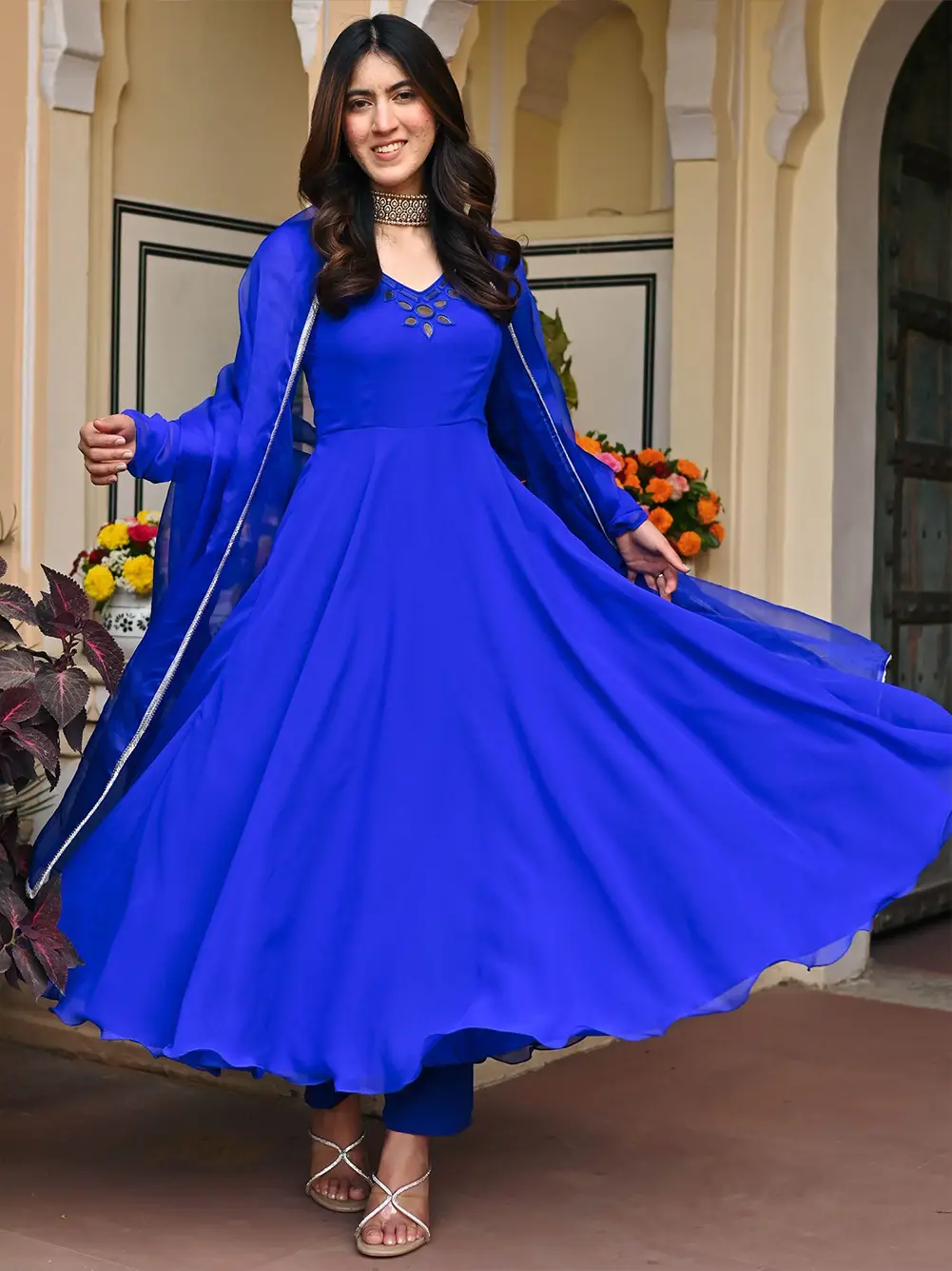 An electric blue mirror Anarkali set sounds absolutely striking! Electric blue is a bold and vibrant color choice that commands attention, and when paired with mirror work, it creates a dazzling ensemble .
