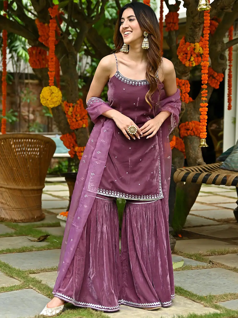 Indulge in elegance with our Mauve Velvet Sharara Set – a harmonious blend of opulence and grace. This ensemble features sumptuous mauve velvet adorned with intricate detailing, complemented by a flowy sharara bottom that adds a touch of allure. Elevate your style with this luxurious and captivating outfit, perfect for those special occasions that demand sophistication