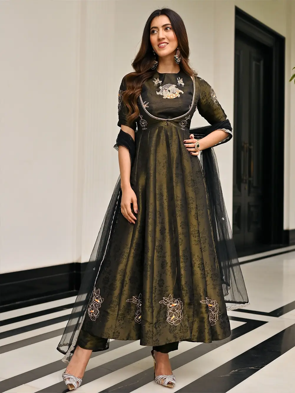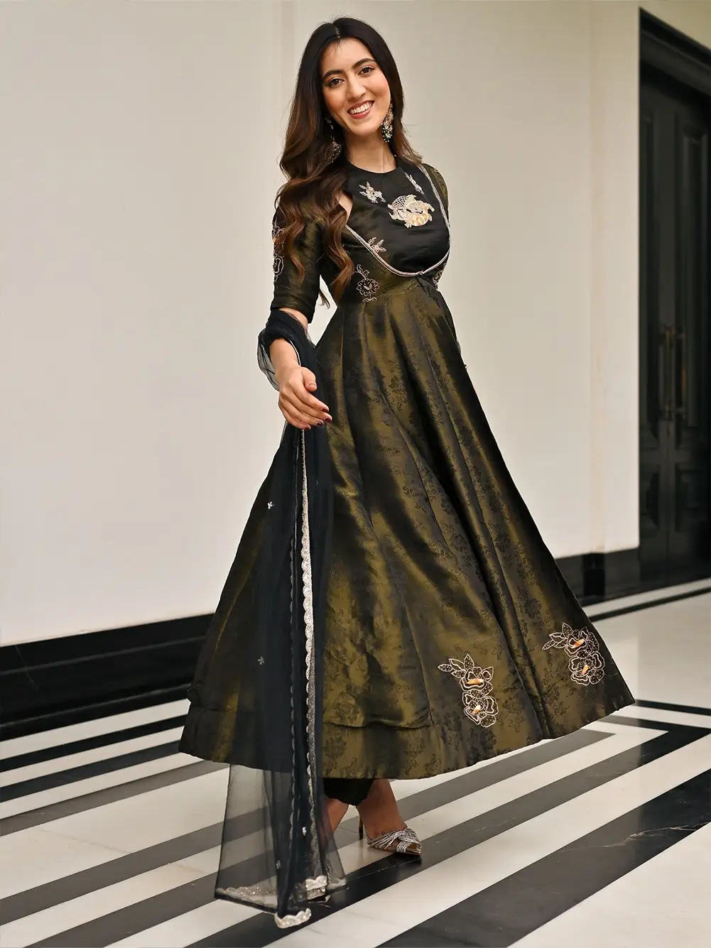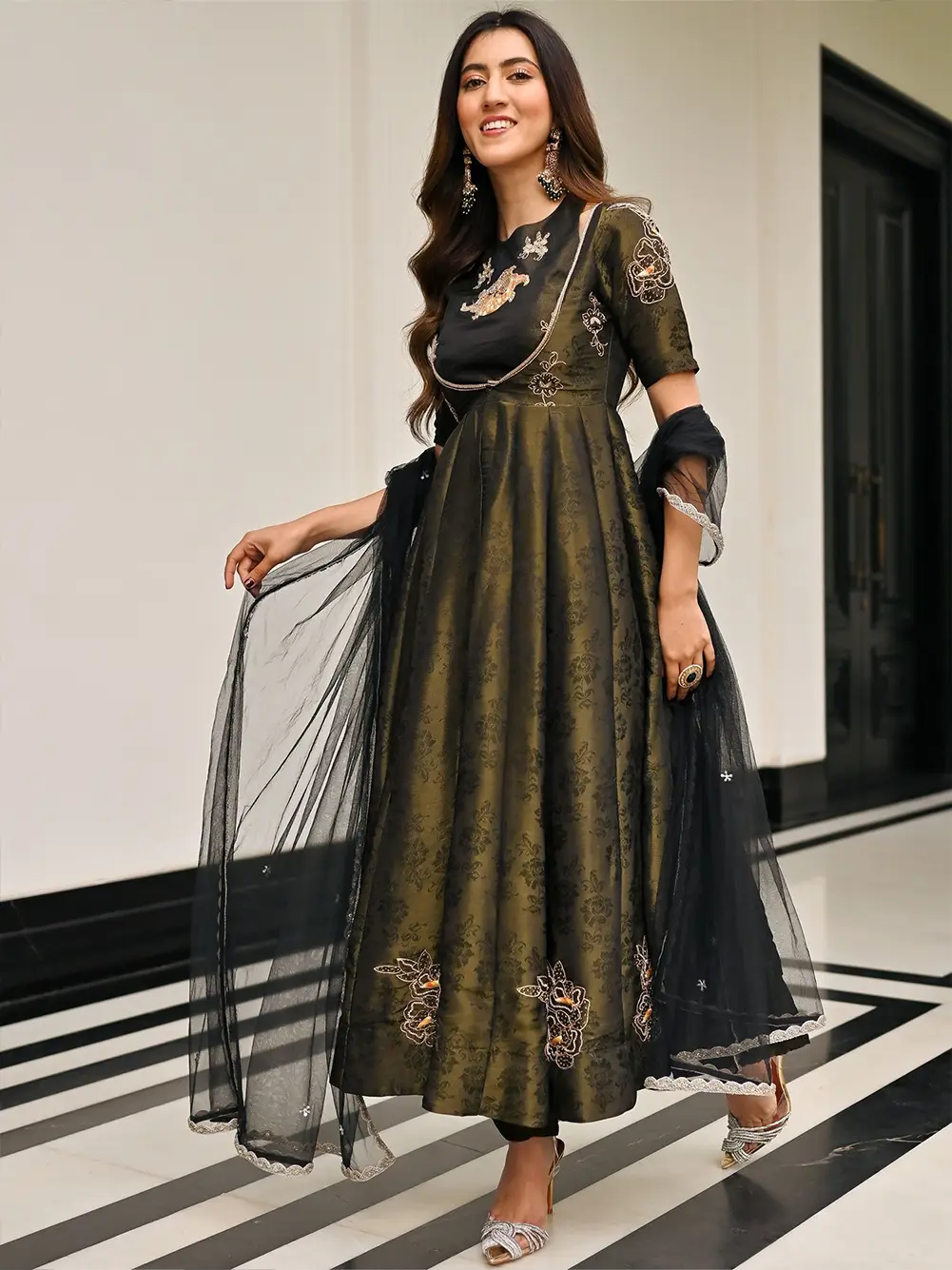 A striking blend of elegance and tradition, this black brocade Anarkali three-piece set is designed to make a bold style statement. Made from rich brocade fabric, the deep black base is enhanced with a touch of gold, giving it a sophisticated and festive look.
